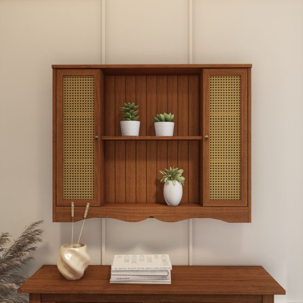 Prateleira de Madeira Multiuso Mallorca Palha Rattan Amêndoa