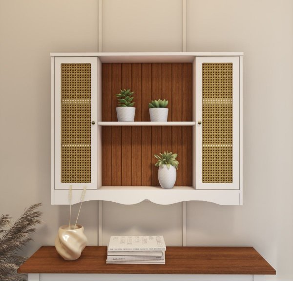 Prateleira de Madeira Multiuso Mallorca Palha Rattan Branco