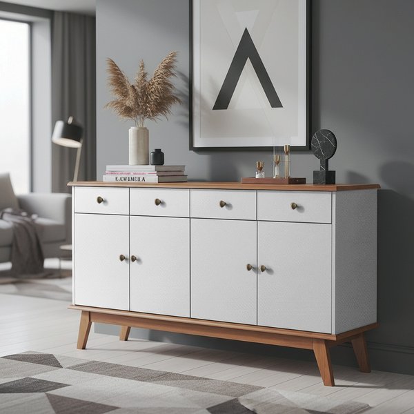 O modelo possui 4 portas e 4 gavetas espaçosas, ideais para armazenar utensílios, louças e mantimentos, mantendo o ambiente organizado e sofisticado. Seu design moderno com traços suaves harmoniza perfeitamente em cozinhas, salas de jantar ou áreas gourmet, levando um toque de requinte e aconchego.