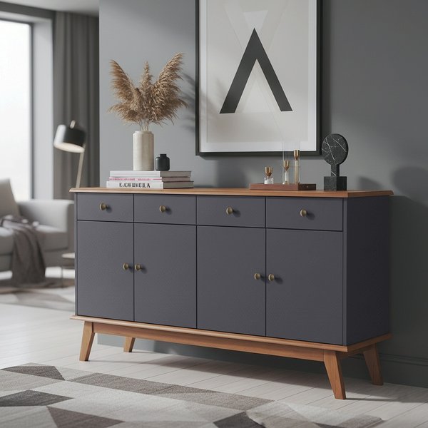 O modelo possui 4 portas e 4 gavetas espaçosas, ideais para armazenar utensílios, louças e mantimentos, mantendo o ambiente organizado e sofisticado. Seu design moderno com traços suaves harmoniza perfeitamente em cozinhas, salas de jantar ou áreas gourmet, levando um toque de requinte e aconchego.