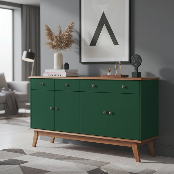 O modelo possui 4 portas e 4 gavetas espaçosas, ideais para armazenar utensílios, louças e mantimentos, mantendo o ambiente organizado e sofisticado. Seu design moderno com traços suaves harmoniza perfeitamente em cozinhas, salas de jantar ou áreas gourmet, levando um toque de requinte e aconchego.