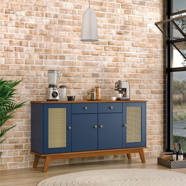 Balcão Buffet Aparador 4 Portas 2 Gavetas Madeira Expresso Palha Rattan Azul