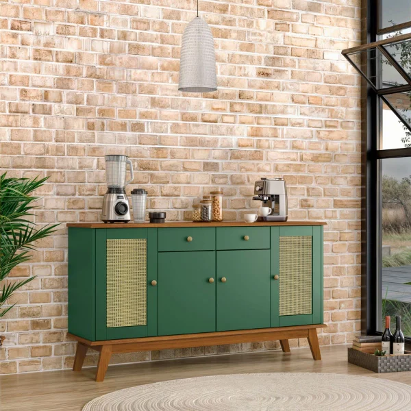 Balcão Buffet Aparador 4 Portas 2 Gavetas Madeira Expresso Palha Rattan Verde
