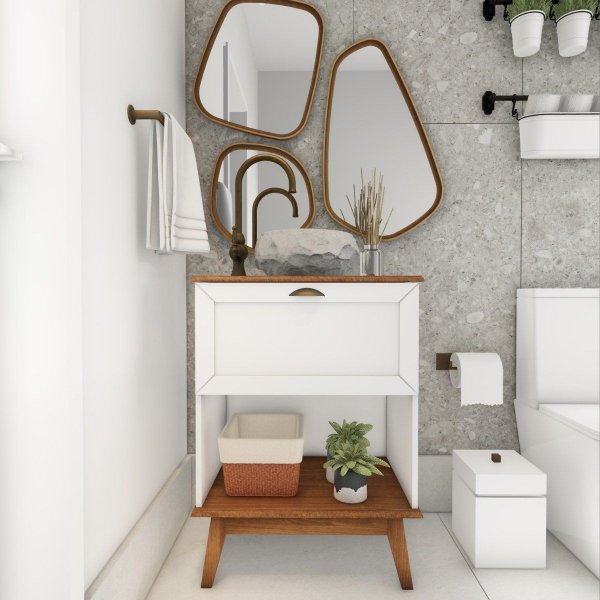 Ele conta com um nicho multiuso, para decorar ou guardar objetos, ou toalhas. O tampo não acompanha nenhuma perfuração, nem o fundo do móvel. Quaisquer alterações são por conta do cliente.