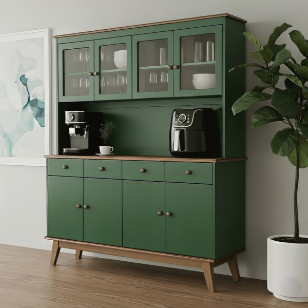 - ✔️ 4 portas superiores com vidro para expor louças, taças e objetos decorativos.